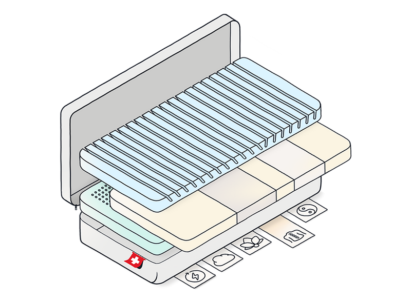 Statt eines einfachen Matratzenkerns oder fest verklebter Schichten ohne signifikanten Mehrwert basiert unsere gesundheitsorientierte Schlaftechnologie auf durchdachten Funktions- und Komfortschichten. Jede Schicht ist so gestaltet, dass sie die Vorteile eines Materials voll ausschöpft und einen speziellen Effekt erzielt, den Du Dir über die Anordnung innerhalb des Schlafsystems erschließen kannst.