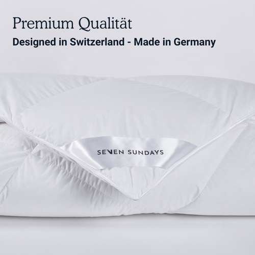 Die SEVEN SUNDAYS Ganzjahresdecke ist ein qualitativ-hochwertiges Produkt Made in Germany und designed in der Schweiz. Sie wurde entwickelt, für alle die auf einen erholsamen Schlaf nicht mehr verzichten wollen - im Sommer, wie im Winter. Die hochwertigen Daunen sind aufgrund ihrer hohen Füllkraft besonders flauschig und voluminös, wodurch sie Dein Bett zu einer Wohlfühloase machen – und das bei geringerem Gewicht. Für ein optimales Schlafklima und eine angenehme Schlaftemperatur, über das ganze Jahr, sorgen die klimaregulierenden Eigenschaften von Daunen.