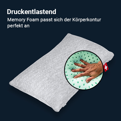 Visco Schaum der Luxusklasse macht unser Reisekissen besonders funktional. Dank des viscoelastischen Schaumes kann sich das Kissen an jede Gegebenheit anpassen – ohne Einschränkung der Stützfunktion oder des Liegekomforts. Das hochwertige Material ist besonders langlebig und bleibt auch bei strapaziöser Beanspruchung lange formstabil. Durch Körperwärme wird es elastisch und passt sich dem Körper stets konturgerecht an. Das ermöglicht eine optimale punktuelle Druckentlastung. Das Kissen gibt nur dort nach, wo es belastet wird und sorgt so für spürbare Entspannung bei orthopädisch wirksamer Stützung von Kopf und Nacken auf Basis eines zuverlässigen Memory Effekts.